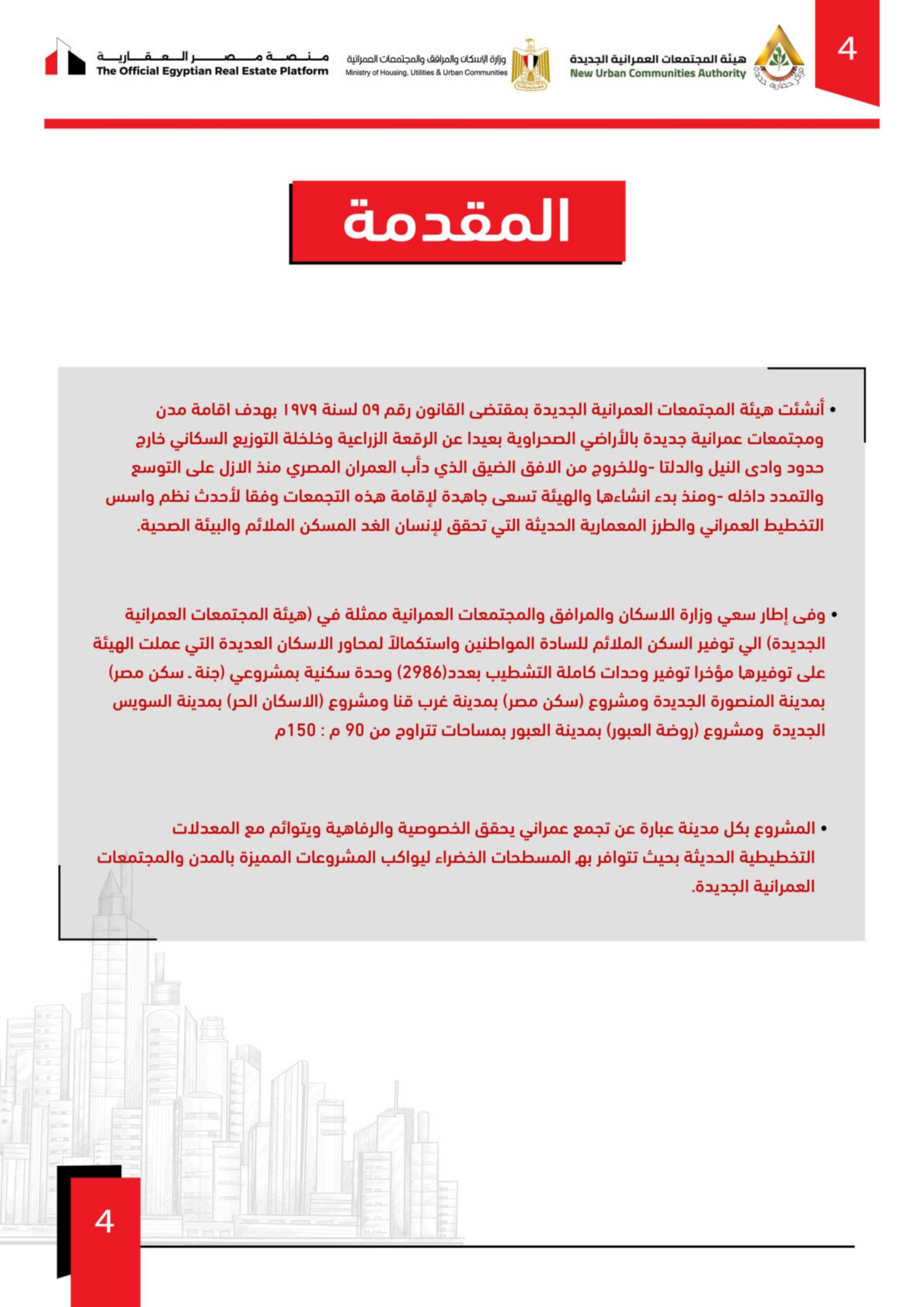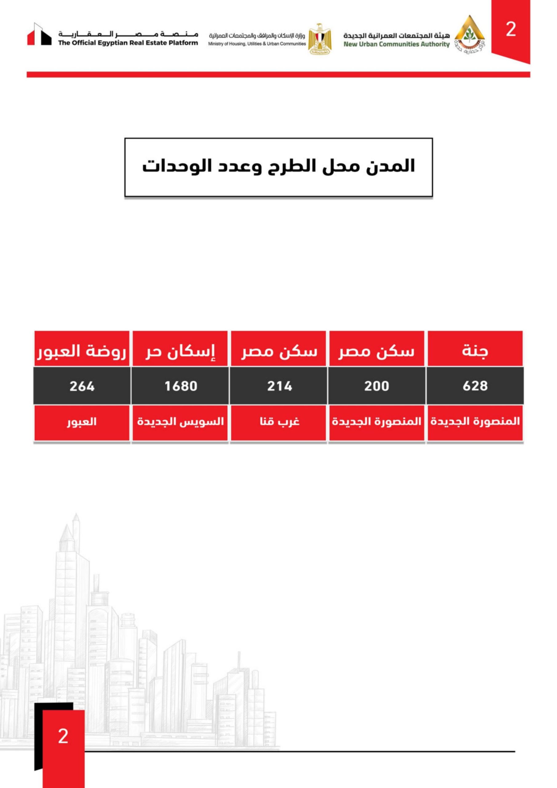 ويركز هذا الطرح على توفير وحدات سكنية في مختلف المدن الجديدة، حيث يستهدف شريحة واسعة من المواطنين.