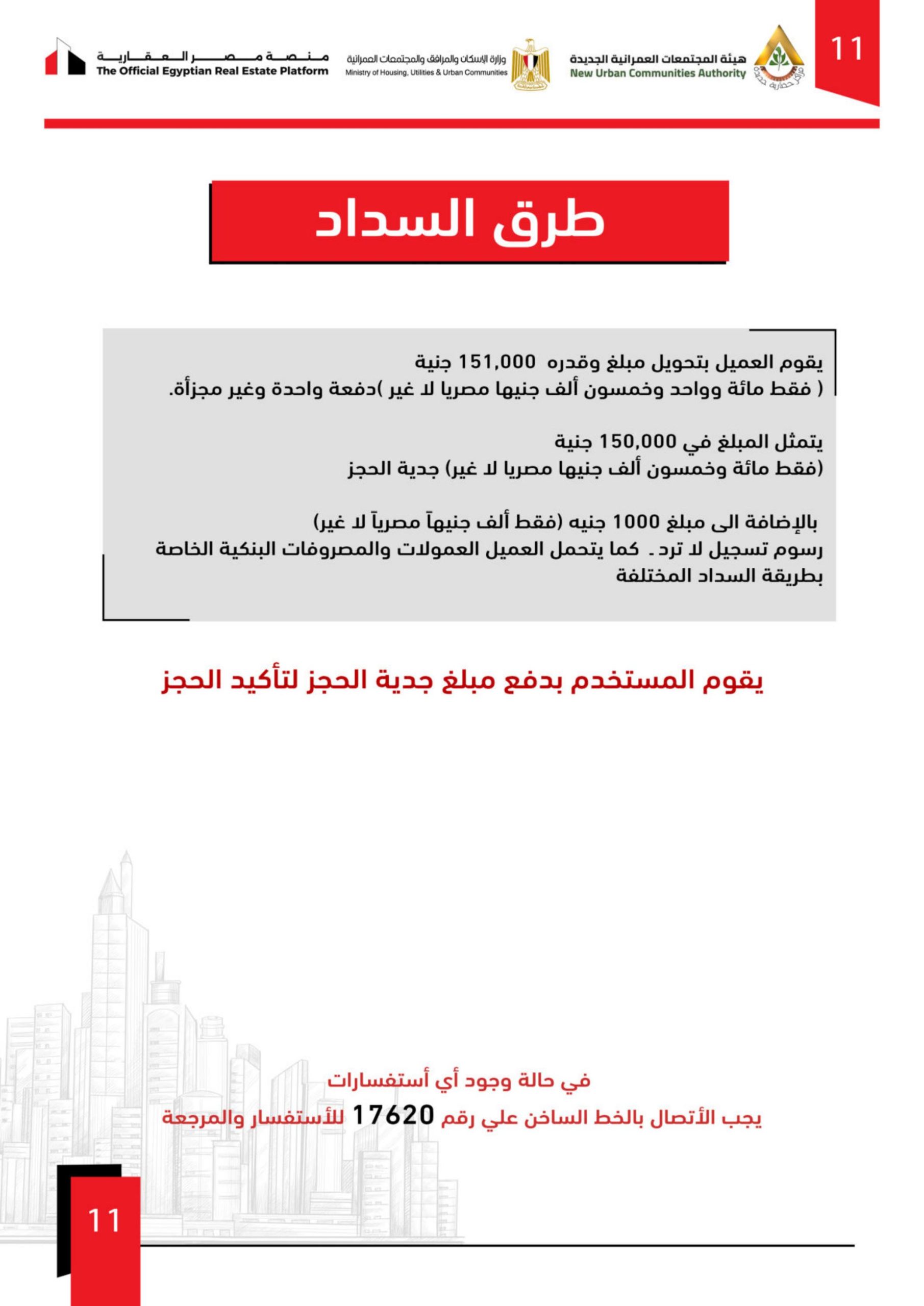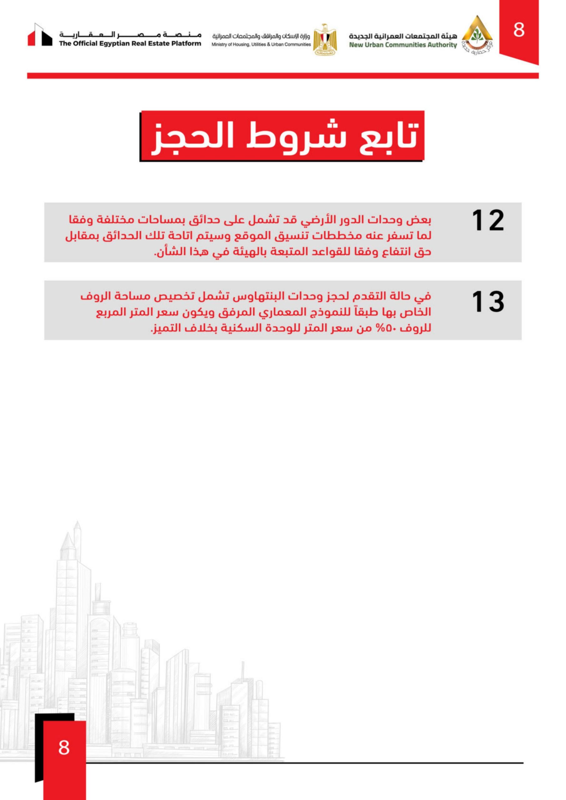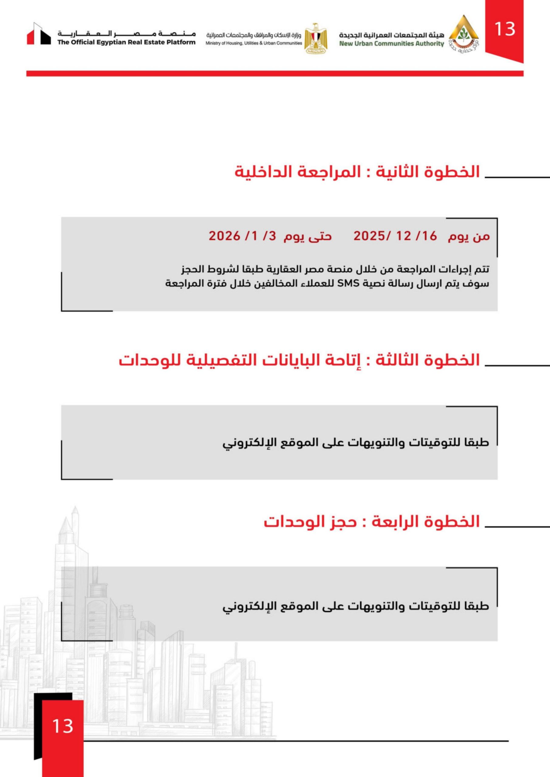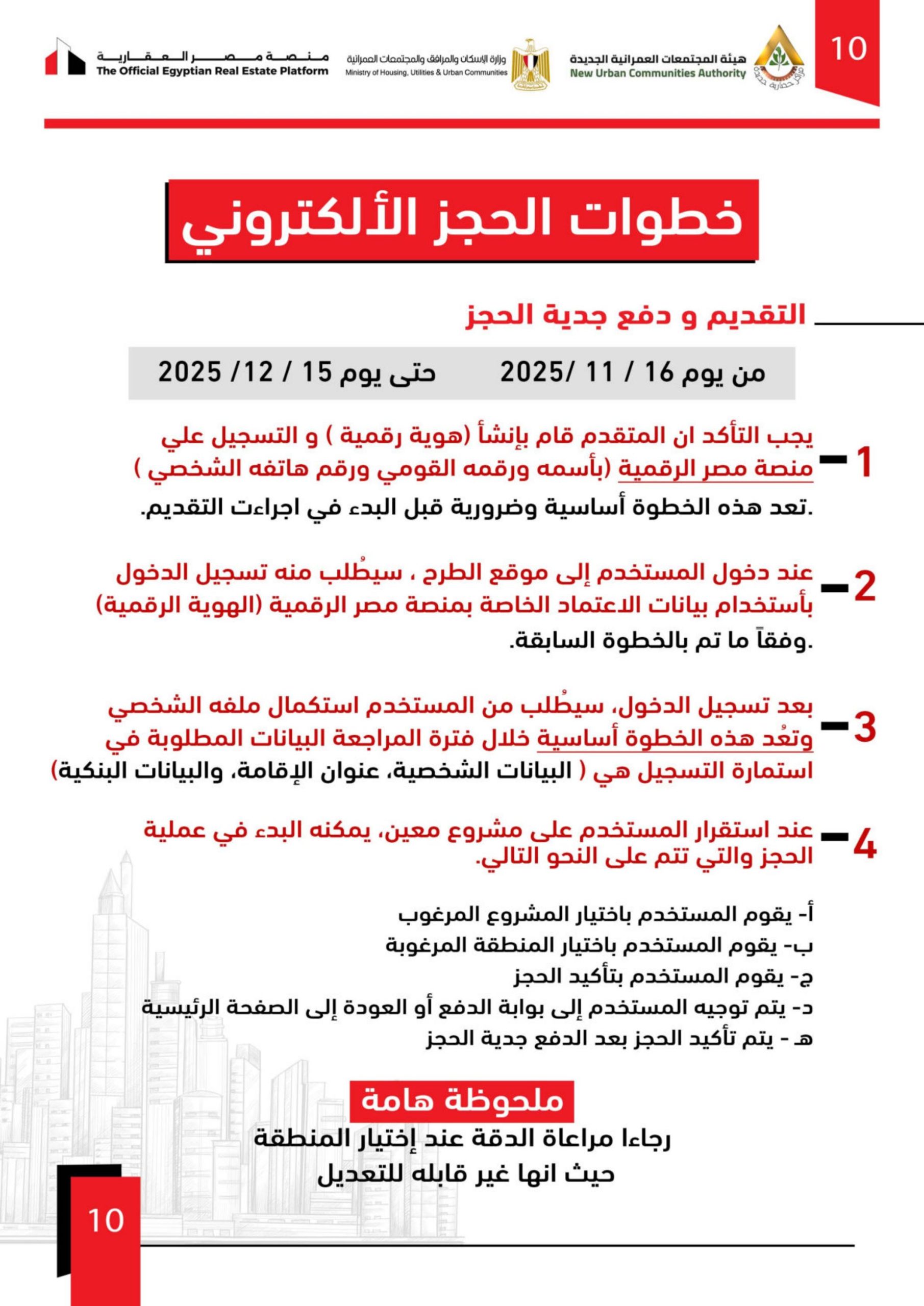 - موعد الحجز: يبدأ سداد جدية الحجز ودفع المقدم اعتباراً من يوم الأحد الموافق 16 نوفمبر 2025.