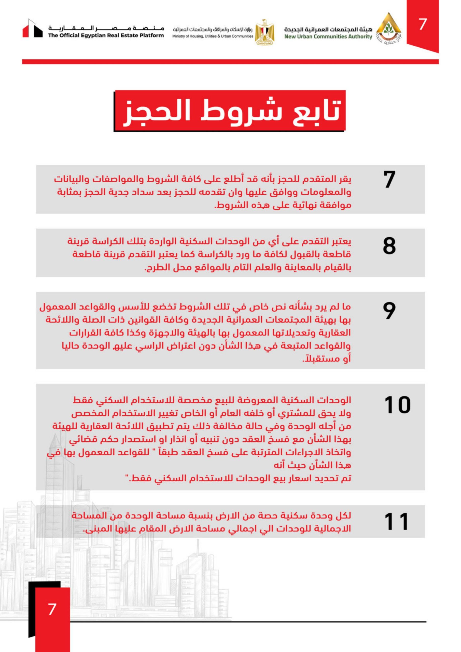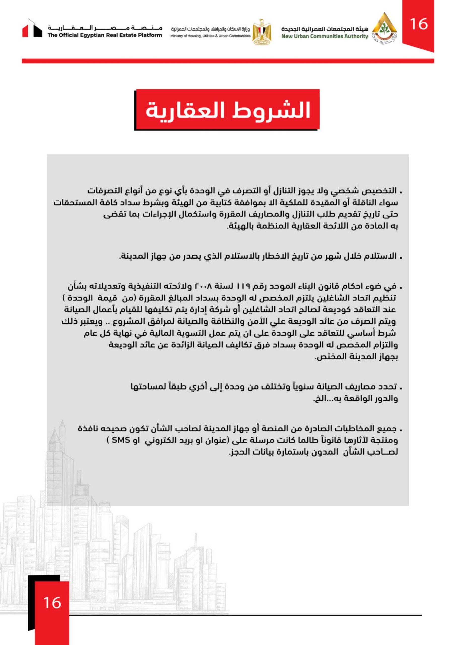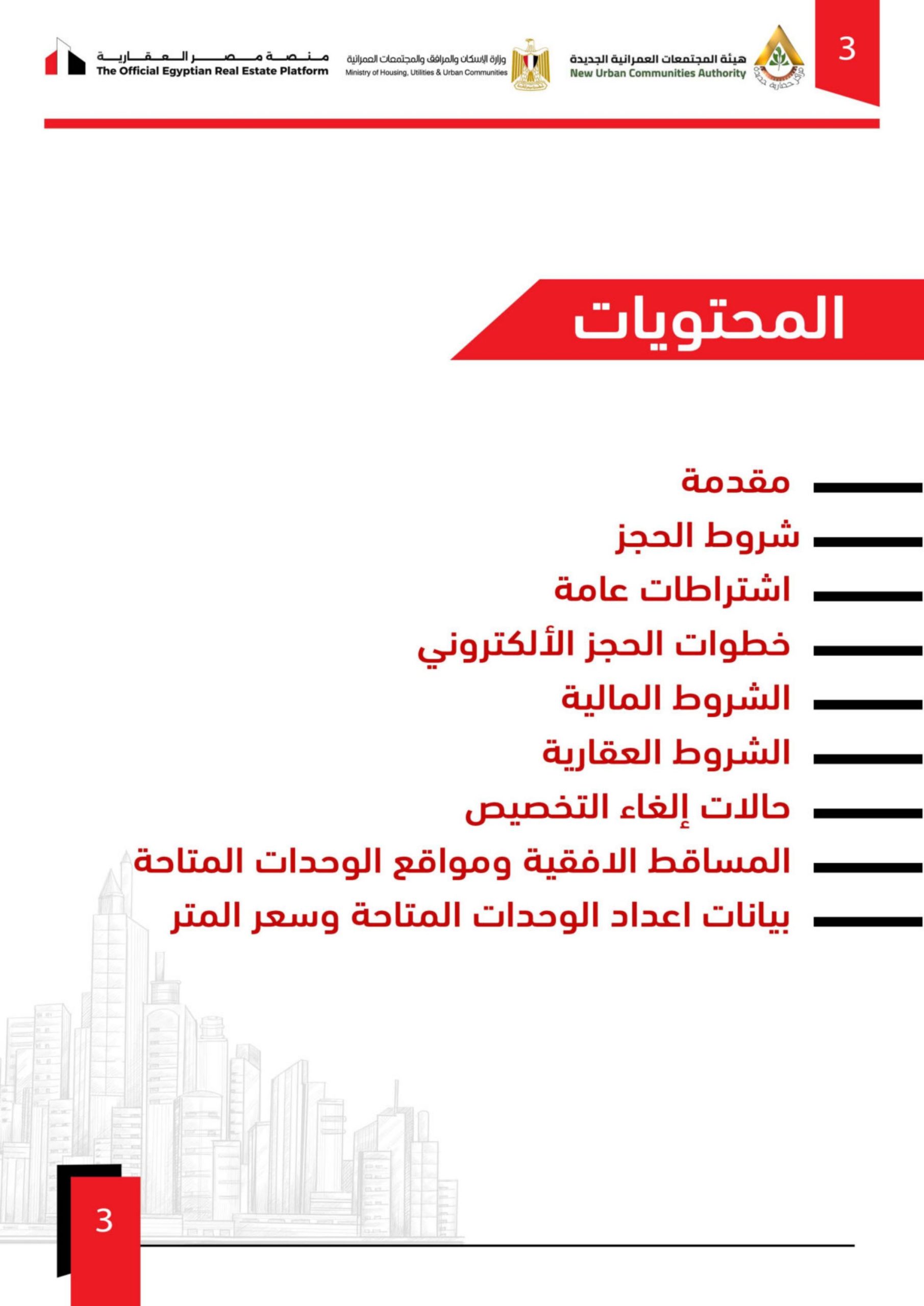 - مكان التقديم: يتم الاطلاع على كراسة الشروط والتسجيل لإنشاء حساب شخصي على “منصة مصر العقارية” المخصصة للحجز.