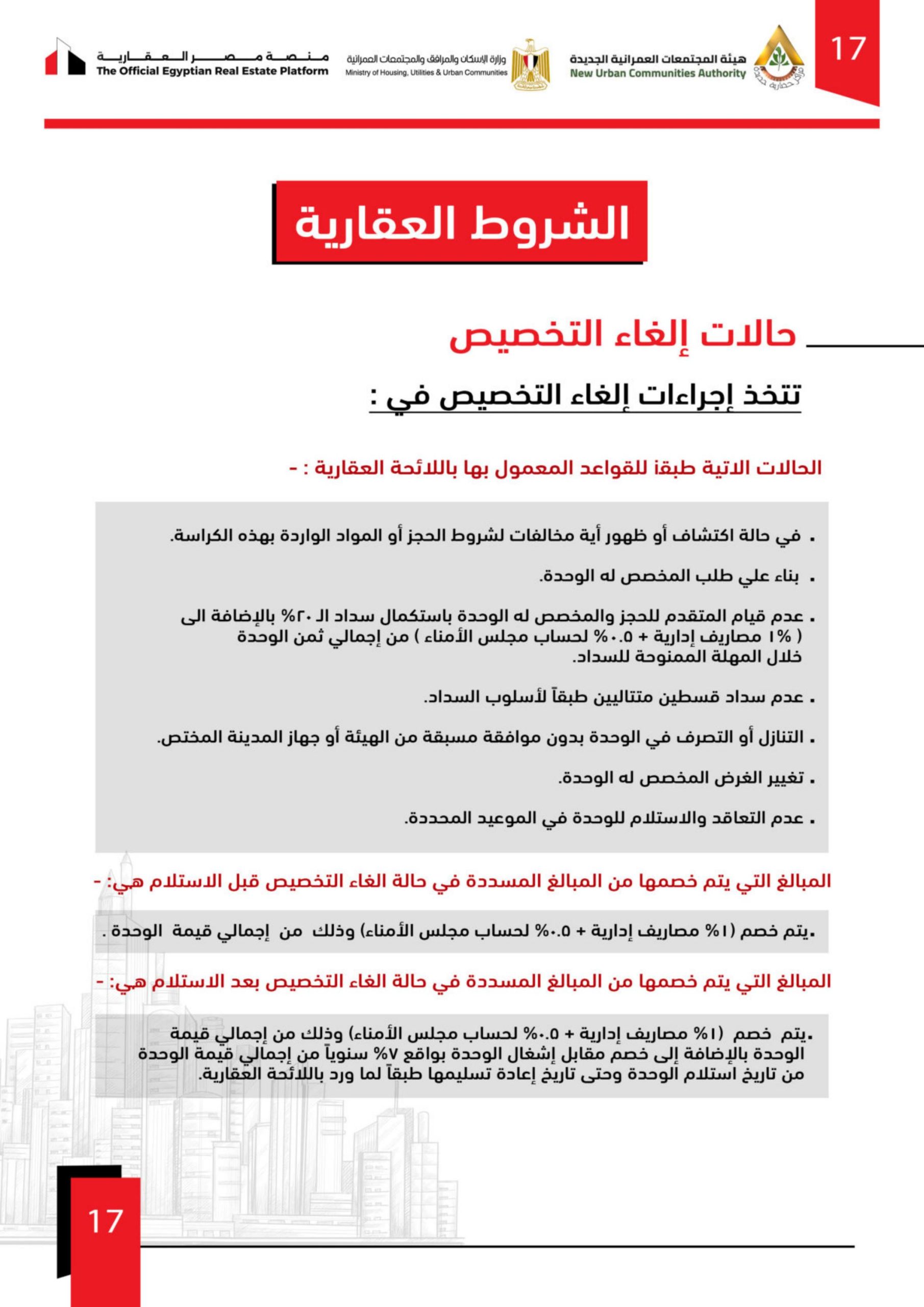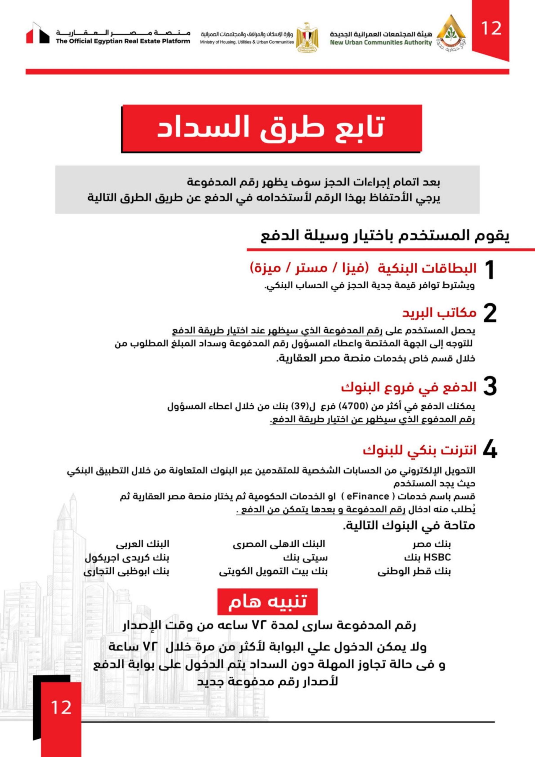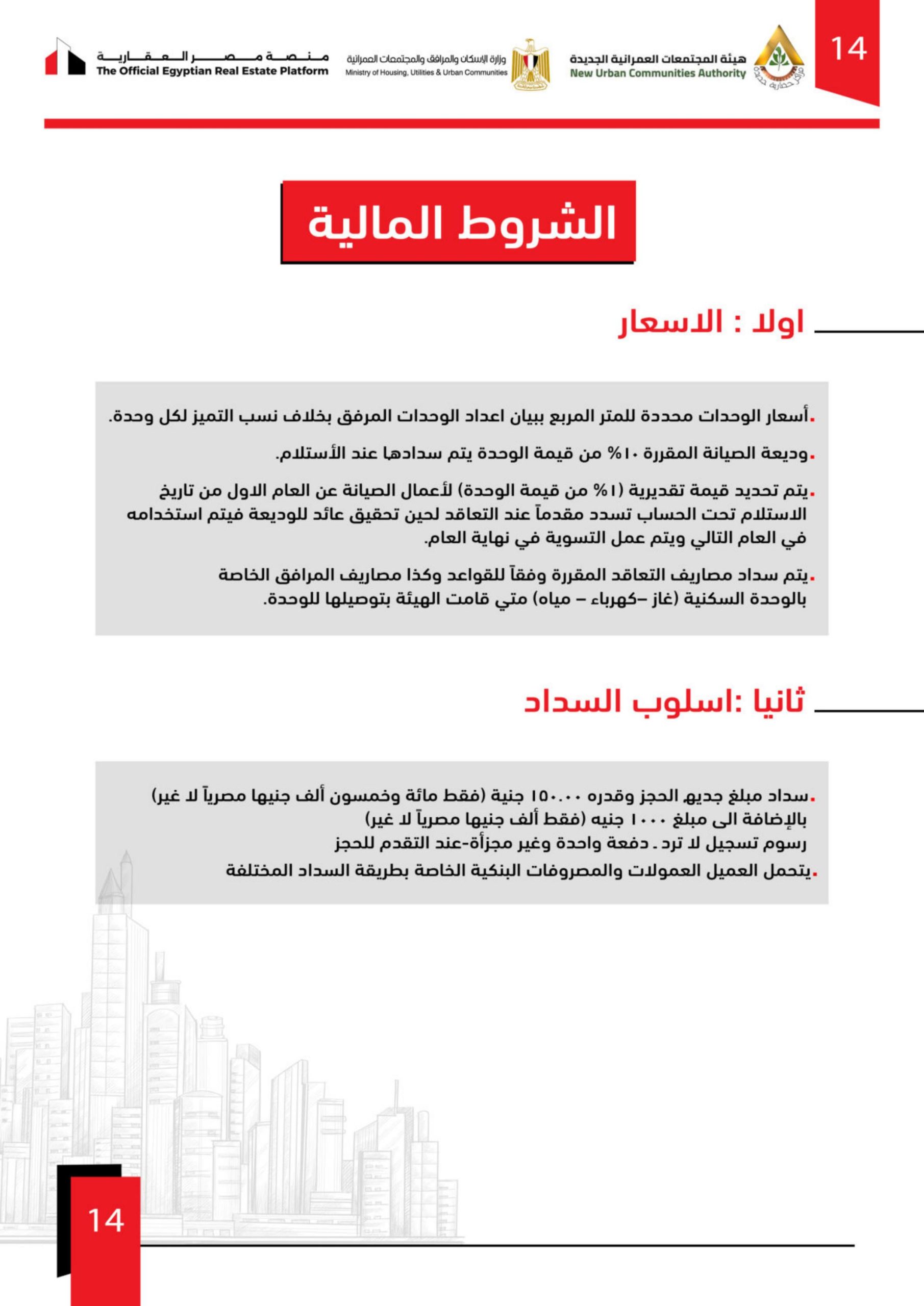 - مكان التقديم: يتم الاطلاع على كراسة الشروط والتسجيل لإنشاء حساب شخصي على “منصة مصر العقارية” المخصصة للحجز.