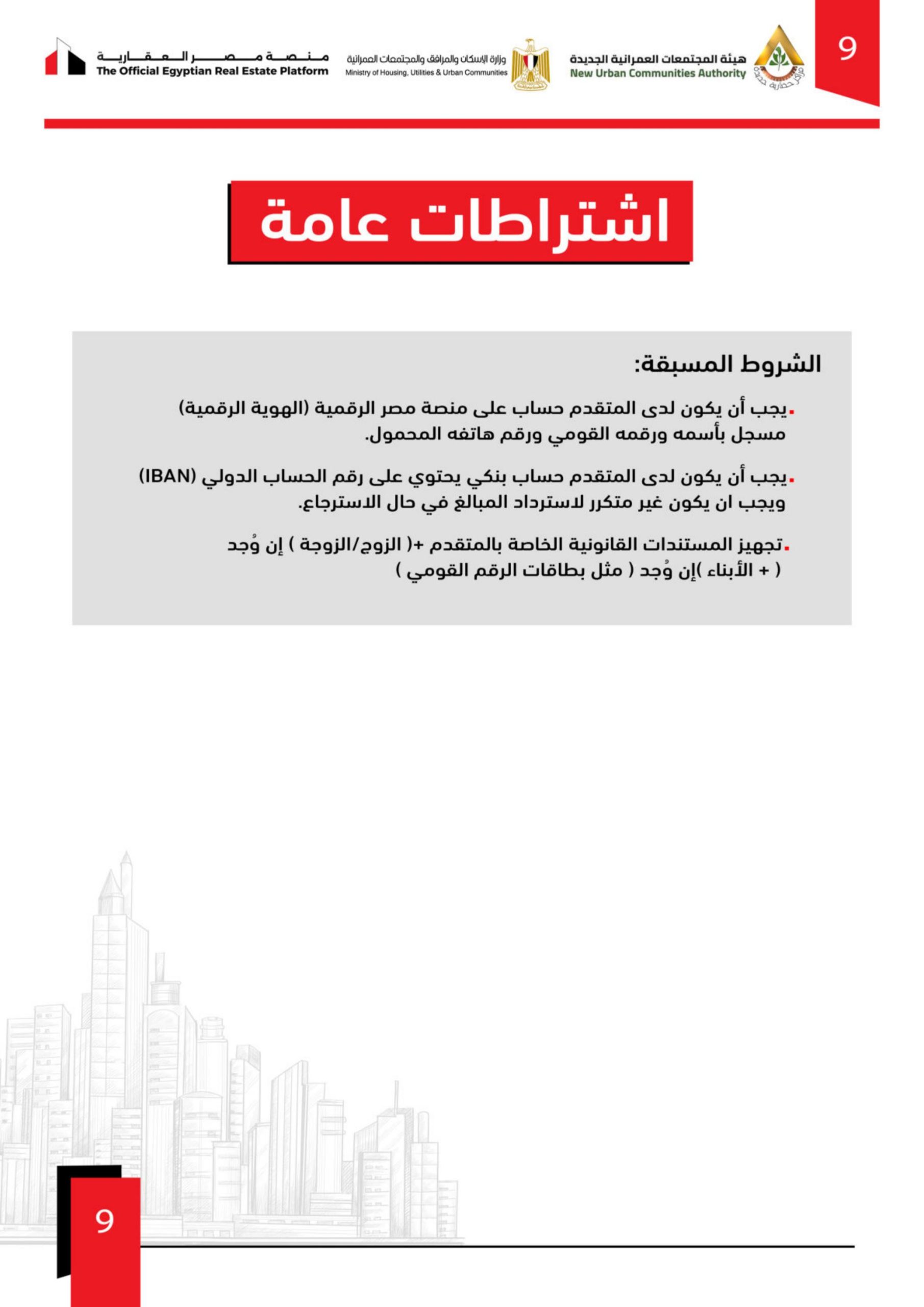 أكدت الوزارة أن كراسة الشروط باتت متاحة إلكترونياً، وأن عملية التسجيل والحجز تبدأ خلال أيام. وفيما يلي أبرز الشروط العامة التي يجب أن يلتزم بها المتقدم: